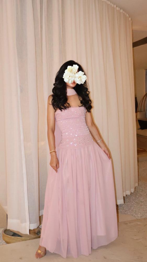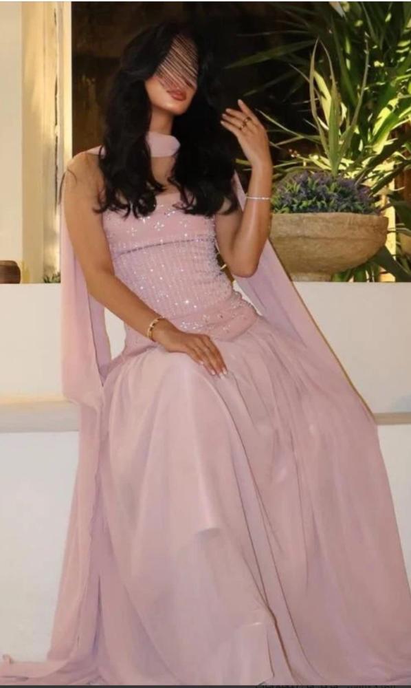 فستان سهرة طويل باللون الوردي الناعم، يتميز بتصميم أنثوي ساحر مع جزء علوي مزين بالترتر اللامع ليضفي بريقًا خاصًا. ينسدل الفستان بقصة واسعة ومريحة، ويأتي مع وشاح خفيف يكمل الإطلالة الرقيقة. مثالي للمناسبات الخاصة والاحتفالات، ليمنحكِ حضورًا ساحرًا.
